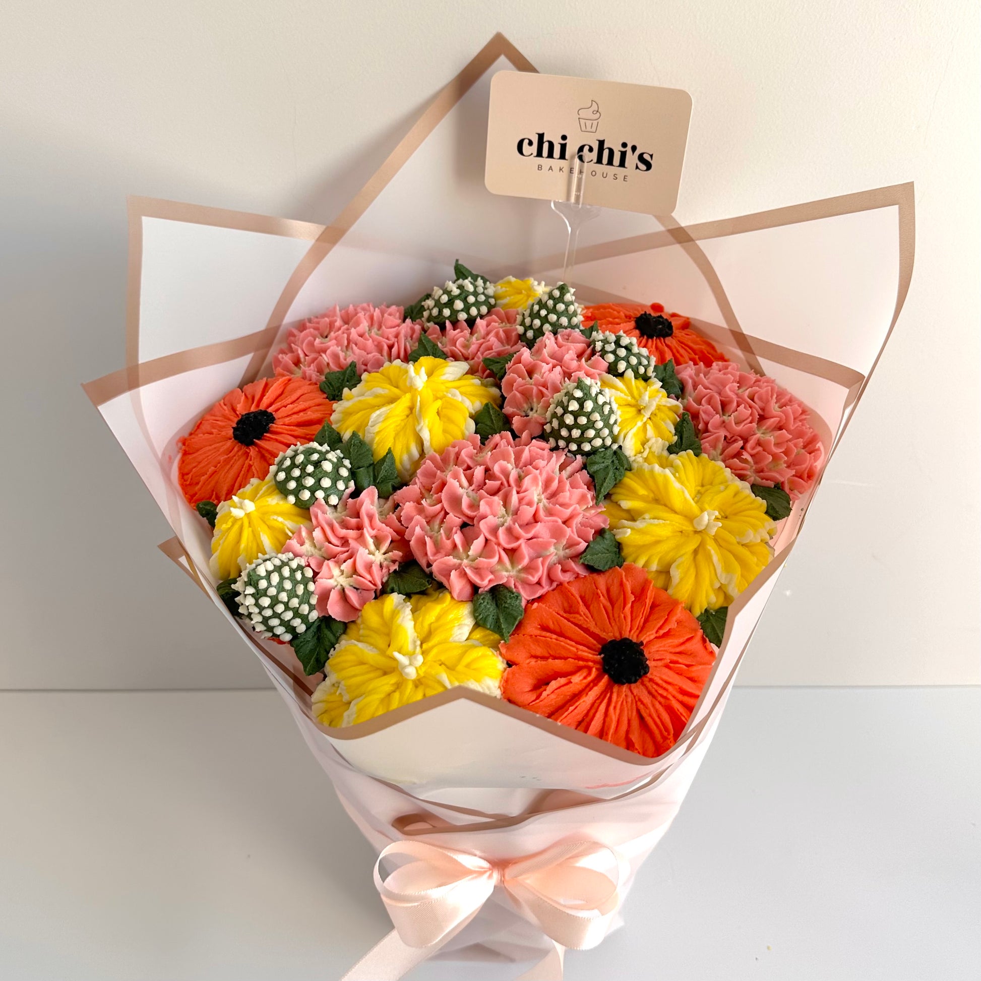Each bouquet is customisable by cupcake flavour and colour. You may select up to 3 main colours. Style of flowers will match the image shown however arrangement may vary slightly.
